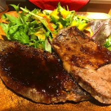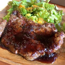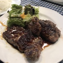 ステーキランチ 1,000円 ステーキがぽっきりでいただけるので、昼時にはかなりの行列ができます 肉自体はそれほど悪くはないのですが、スジのところがナイフで切りづらいのが難点です ごはんは普通はやや少ないので、無料の大盛がオススメです 夜のコース料理も気になります