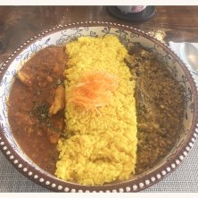 カレーあいがけ(右:大根人参トナカイ肉の辛〜いカレー 左:チキンとマッシュルームのカレー)とダール😃 後からジワジワ辛くなってくるトナカイカレーと程よい辛さのチキンカレーのあいがけに優しい味わいのダールを混ぜ混ぜ、野菜もたっぷりで大満足です😄