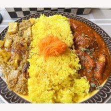 あいがけカレー(牛すじカレー、菜の花お揚げと豚ひき肉入り和風マサラ)にアチャール2種(大根人参、パクチー)😃 スパイス控えめながらほっとする美味しさの和風カレーにネパールの漬物アチャールが絶妙なマッチングです👌