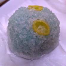 萩の露 こし餡を道明寺生地で包んだ上に更に葛絞りで包んでいます。葛と道明寺という食感が異なる生地の混濁した不思議な食感が個性的なお菓子です。