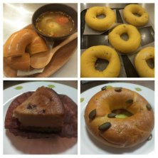 先週に引き続き、料理教室でカボチャのベーグル作ってきたよ🎵 左上が先生が作った試食品、右上が焼く前の状態。左下がそこの店で売っていた豆腐と甘酒のラズベリーケーキ、右下のが私が作ったカボチャのベーグル。
