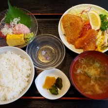 今日のランチは初訪問の此方にて ランチAセット1,000円 豚焼き肉とお刺身のセットですがもりが良いです。