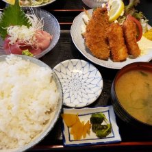 ランチセットBのアジフライ、イカフライ、刺身! 1,000円しますが味、量ともに満足でしたっ