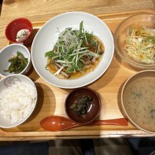 ランチはルミネの上 前回混んでてあきらめたおぼんdeごはんさん いろいろメニューがある中今日は麦富士豚のすりおろし野菜ソース 五穀ひじきご飯を選択黒胡椒がきいた豚肉ソテー美味しかったです。ご飯と味噌汁はおかわり自由 私はお肉もご飯も連れに食べてもらったけど他のテーブルは男女でもお代わりしてました。丼物、饂飩、サラダメインとか色々で人気なのも納得