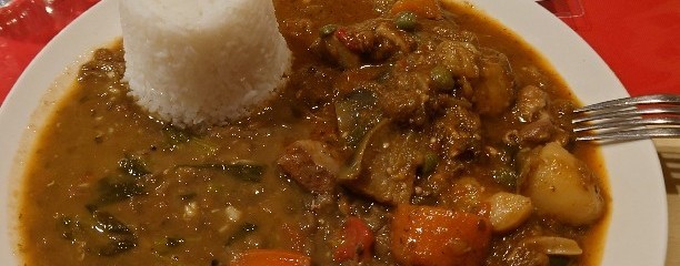日替りランチは、ご飯と鶏と野菜の煮込みと豆の煮込みが半分づつのっている。ご飯は細長めでパラッとしていて煮込みと混ぜると丁度よい👍卓上に5〜6本ある辛味調味料から好みのものを選んでかけたら、更に美味しくなった。