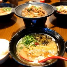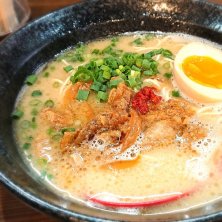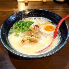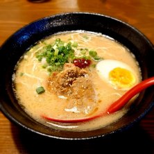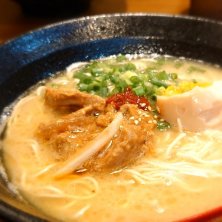 「郡上豚骨ラーメン」 今日は同窓会出席のために郡上八幡にいます。 お昼ごはんにカンミナで郡上豚骨ラーメンを頂きました。 通常の豚骨と違って鶏ちゃんがのっています。 豚骨ラーメンだけあって麺の硬さが選べます。 当然粉落としで食べて、替玉も頂きました。 今日も美味しく頂きました。