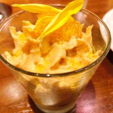 うにのエスプーマ! 上の方はうにのエスプーマ、下の方には細かく切ったイカと海老があり、ベシャメルソースが♥️