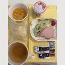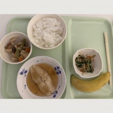 米飯 蒸しむきガレイ ふきと筍の炒め煮 もやしの中華和え 果物