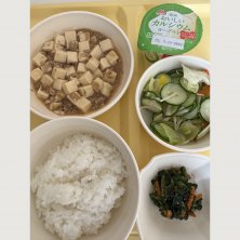 米飯 麻婆豆腐 彩りサラダ 菜花のごま和え カルシウムヨーグルト