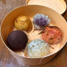 タケノとおはぎ@川崎市 武蔵小杉(特設会場) きな粉とレーズン(左上)、江戸紫(右上)、こしあん(左)、干し芋とビーツ(右)、ココナッツとピスタチオ どれもこれもエキセントリックなおはぎですが、破綻しているものは一つもありません 見た目が美しくそれだけでテンション上がりますが、お味は好みが分かれるかも 結局一番美味しいのはやっぱりこしあんね、となりました