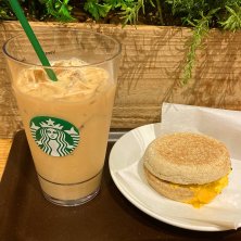 スタバでモーニング。 ✳︎アイススターバックスラテ (モーニングサービスで 無料でトールにサイズアップ) ✳︎あらびきソーセージパティ&スクランブルエッグイングリッシュマフィン(長いネーミング💦)