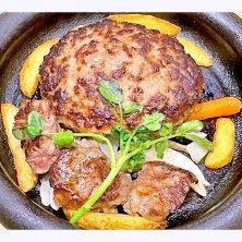 ステーキとハンバーグのチェーン店、宮崎ステーキハウス 霧峰の国産牛粗挽きハンバーグ200g&オーストラリア産切り落としヒレステーキ80g。ライスとサラダがセットで付く。