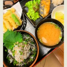 お風呂の王様志木店! 春のおすすめの、ひめたけの天ぷらと鰆の定食! ひめたけってキノコかと思ったらタケノコの新芽らしい⁇ ひめたけの天ぷらはともかく鰆の焼物は小さいし釜揚げしらす丼も量が少ない! 満足度としてはイマイチでした( ; ; )