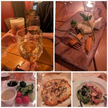 3月4日の4軒目 娘の旦那さんも合流してワインで乾杯 チーズ盛り合わせ バーニャカウダ ピザ パスタ 美味しかったけどワインは酔いますね