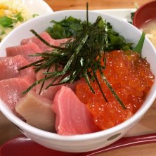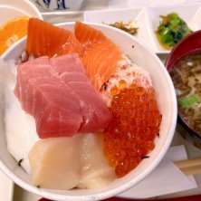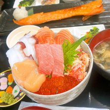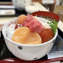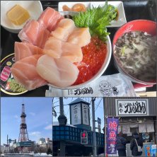 北海道 札幌✈️③ 魚や「がんねん」 🌸海鮮6色丼 🌸サーモンはらす燻製焼き 札幌二条市場の一角にある「がんねん」 朝8時開店だけど1時間前から行列なお店です😊 海鮮が美味しいのです😆💕 小さなお店なので出遅れるとすごく待つので 今日は頑張って早く並んで 一番目のグループで入れました✌️ 海鮮も美味しいけど 銀ヒラス、銀ダラ、ホッケなどなど 焼き魚のシリーズもめちゃ美味しいので 選ぶのに迷いました〜 サーモンハラス焼き大正解でした😆✨