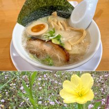 ばんごはん★2025.6.3 珍しく夜にラーメン。 & 珍しく見つけたマツヨイグサ。 (似てるけど月見草は花が白いんだって)