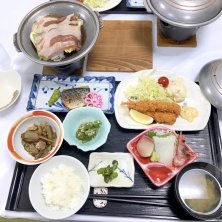 本日の晩御飯 相変わらずここの晩御飯はメインが3つも四つもあってボリューミー…🤭笑笑 でも今日はお腹空いていたから、しっかり頂きました。 お肉の気分だったからお肉食べれて嬉しい😆 それに牛丼の頭まで… ご飯に乗せて、豚ロース肉の陶板焼きまでしっかり食べました😋 御馳走様でした(^人^)