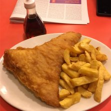 エイのフィッシュ&チップス 広げた手のひらよりも大きい。デカすぎ。 モルトビネガーをぶっかけるととてもおいしい