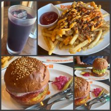 アメリカ人率高い店 私 オリジナルバーガー(小) 夫 BLT シェア プルドポークメルトフレンチフライ 持ち帰り ぶどう100%ジュース (ユッキーファーム) 小は小さ過ぎてガッカリしていたら 夫が半分くれた かたじけない バーガーには紫キャベツと青唐辛子、ともう一つ季節の野菜のピクルス付 隣のアメリカ人がスクワッシュのピクルス美味しいと言っていた。よくコリンキーだってわかったね 店でも飲めるぶどうジュース 一本はウチ用、もう一本はプレゼント用