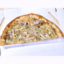 神奈川県と東京都に数店舗有る持ち帰りピザの店、ピザオリーブの期間限定メニュー、〜トリュフ薫る〜3種のきのこパンチェッタのハーフサイズ。 しめじ、舞茸、エリンギ、パンチェッタ、オニオン、パルメザンチーズ、EXVオリーブオイル、特製フレンチチーズ、特製トリュフソースが入ったピザ。木の子とチーズの旨味が良い。 普段は自転車通勤の為、余り京急には乗らないが、帰りは雨の為、電車で帰る事にした。その際、京急川崎駅の改札を出る前に寄って買った。もう1種類も食べたかったのでハーフサイズにした。