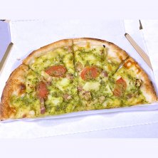神奈川県と東京都に数店舗有る持ち帰りピザの店、ピザオリーブの熟成パンチェッタと北海道ポテトのジェノベーゼのハーフサイズ。 熟成パンチェッタ、北海道のジャガイモ、フレッシュトマト、ガーリック、パルミジャーノレッジャーノ、EXVオリーブオイルと3種類の特製ブレンドチーズが入ったピザ。 普段は自転車通勤の為、余り京急には乗らないが、帰りは雨の為、電車で帰る事にした。その際、京急川崎駅の改札を出る前に寄って買った。もう1種類も食べたかったのでハーフにした。