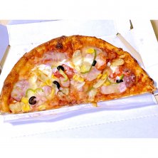 神奈川県と東京都に数店舗有る持ち帰りピザの店、ピザオリーブのオールスターデラックスのハーフサイズ。 サラミ、ベーコン、ウィンナー、フレッシュトマト、コーン、マッシュルーム、オニオン、ピーマン、マヨネーズ、ブラックオリーブ、特製チーズとトマトソースが入ったこの店の人気No.3のピザ。 普段は自転車通勤の為、余り京急には乗らないが、帰りは雨の為、電車で帰る事にした。その際、京急川崎駅改札内で前から気になっていたこの店に寄って試しに買ってみた。もう1種類も試したかったのでハーフにした。味は美味かった。