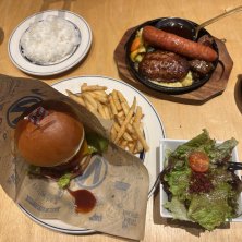 Today’s Lunch お肉と熟成肉ハンバーグ♪ ライスとサラダ付き。 表面カリカリに焼けたハンバーグ美味しい〜〜 こちらのお店は、朝から晩まで魅力的なメニューなのだけど、今は期間限定でランチタイムを延長してる。