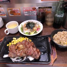 ヒレステーキ🥩200グラムにご飯と🍚スープ、サラダ🥗付けて。 やっぱりわさび醤油が合う。