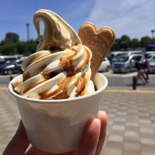 2019/04/28(日) ✴︎黒みつきなこソフト ¥450 ソフトクリーム100本ノック ₍₍ (ง ˙ω˙)ว ⁾⁾99本目 チラシついてた200円引き券使って250円🍦 きなこが迷子ーー!