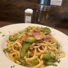 自家製プロシュートコットとゴーヤのペペロンチーノ🍝 自家製ハムの塩気とゴーヤのほろ苦がよいコンビです モチモチ感ありつつ歯切れの良いカラヒグ麺も美味しいです👌