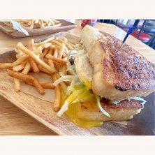 朝からたくさん歩かされたことで機嫌が悪くなるマイサンを、誰もいないところでがっつりしばいて 昼ごはん。 信号が壊れてて青に変わらないなんて誰が予想できるよ?怒 そしてサンリクエストのハンバーガー 私はフレンチトーストハンバーガー かろりーやばそうだろ〜♡笑笑