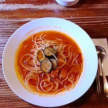 ランチ チーズベーコンスパゲティ サラダ バケット アイスコーヒー このお店に来るとやはり1番人気のチーズベーコンを頼んでしまう。 ちょっと味が変わったみたい。 スープが薄い😅残念