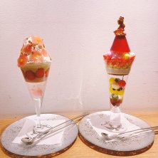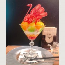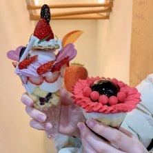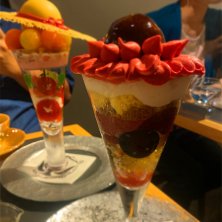 3軒目は念願のお店で〆パフェしたよ〜🤣⤴️⤴️ 蝦夷大山桜パフェ1700円とあんみつ姫1800円をシェア💕 もうやっぱ見るからに可愛い〜😍💓 桜の方は桜ジェラート、桜クレームダンジュ、桜のお餅…と桜尽くしで美味しかった⤴️⤴️ ただ下には鍛高譚(たんたかたん)のジュレが入っててそれがお酒苦手な私にはかなりどぎつかった😢 まぁ、全体と混ぜて食べたら緩和されたけどね👍 あんみつの方はお姫様が真っ赤なスカート(フランボワーズ寒天)をまとっていてこれまたフォトジェニックだったなぁ💓💕