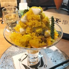 mimosa 〜銀葉アカシア〜 ほんのりウコンのジェノワーズ パッションフルーツ香るメレンゲ ソフトクリーム パッションフルーツチョコレート 抹茶チョコレート レモン香るメレンゲ 金柑コンポート アーモンドガレット ヴェローナ70%チョコレートジェラート コアントロー香るカタラーナ ライムダンジュ 柑橘のコンフィチュール ほんのりリジンとディル、金柑の香りのジュレ ミモザ(アカシア)をイメージしたパフェ ドリンクはスパークリングワイン(辛口・白) めっちゃ美味しかったです〜❣️