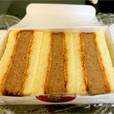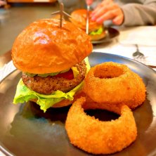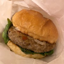 ハンバーグサンドイッチを食べました!少しパサついてましたがご覧のとおり密度が高くて食べ応え抜群でした!コーヒーよりビールの方が合うと思います。
