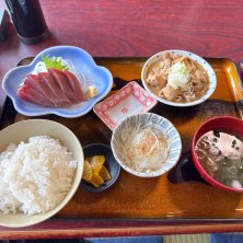 鰤のお刺身。脂ののりが丁度良く鮮度抜群!アジフライも付いてボリューム満点。オニオンスライスも嬉しいポイント。