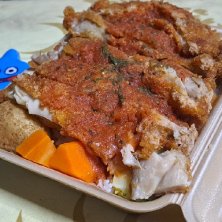 昨日(10月11日(土))の昼御飯 【UberEats/肉山爆太郎】 ●でかトマチキンカツ弁当 1,490円 ご飯特盛300g 100円 トマトガーリックソース♪ チキンカツの下に、蒸かしたじゃが芋、茹でたニンジン、茹でたブロッコリー♪ 唐揚げ丼メインで、牛カルビ丼、豚カルビ丼も有るけど、ほぼ2k円超え😔 これが一番安い♪ 配達料は50円だけど、メンバーシップで50円引き♪ 配達料は近いと安くて、遠いと高い♪