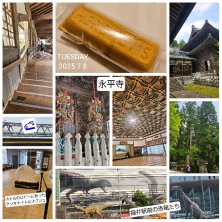 2025/7/8(火)16:44 ぶらり福井旅🚗 今回はホテルに素泊まりで地元で食事を楽しむ旅 曹洞宗大本山永平寺に参拝させて頂きました この日福井は今年初の猛暑日とのことでしたが 静寂の中 雲水さん(修行僧)の作務衣や袈裟の擦れる音、吹き抜ける風 心地よい空間でした 瓦志納金の記念品は数珠でした チェックインしてすぐ温泉で汗を流してきたオットがお風呂上がりのモナカアイスを一緒に食べようと持ってきてくれました ドーミーインホテルのお馴染みのサービスです 朝風呂のサービスは乳酸菌飲料でした