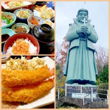 海老の宮川☆ 車海老が食べたくて天草まで足を伸ばしました! 車海老の刺身や塩焼きは写真が上手く撮れてなかった😭 特大車海老のフライは殻ごと衣をつけて揚げてあったからビックリ‼️ でも車海老に限ってはアリかな!美味しかった♡ 買い物に寄った『藍のあまくさ村』で聳え立ってる天草四郎の大きな像に圧倒された😲