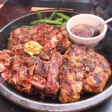 お昼ごはーん(*´∇`*) ワイルドステーキ300とビーフハンバーグ150 いただく(๑˃̵ᴗ˂̵)