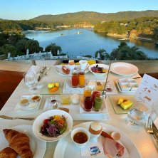 ・柑橘ジュース ・あおさ佃煮 ひじき煮 めかぶポン酢 しらすおろし きのこと水菜のお浸し ・焼魚 出汁巻玉子 染おろし 松阪牛しぐれ煮 ・野菜の炊合せ ・すくい豆腐 生姜 糸花 割醤油 ・伊勢まだいこぶ〆サラダ 柚子ドレッシング ・伊勢たくあん ・あおさの味噌汁 ・白御飯”結びの神” 伊勢芋とろろ粥 2025/10/12 朝食