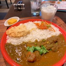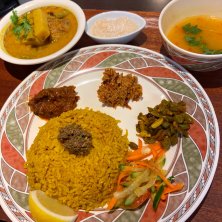 チキンローストポラオ🇧🇩🐔 結婚式やパーティー等の特別な席に登場するバングラデシュ料理がお店の2周年記念で登場しました✨ 濃厚なココナッツカレーソースをまとった骨付きチキンに、チニグラ米という小粒の米を使ったスパイス炊き込みご飯、フライドエッグがトッピングされてます☝️
