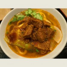 懐かしい中国大陸手延麺 蘭州ラーメン屋さん 手でびょーーーんと延ばしていきます。 結果、9種類もの麺を選べます。 今日は紅焼牛肉麺を太麺で。 ミニ麻婆丼付きの満腹セットに パクチー追加。 ラーメンうまーーーっ! 普通の器と思っていたら、麺たっぷり! 減らない。 説明書き見ると、なんと、なんと、 全長130メートル??! めちゃくちゃコシがある麺をワシワシ。 麻婆丼もかなり美味しい。 お腹いっぱい!! ラーメンも、原点にかえるの大切ですなぁ これは再訪確定。 再見!! 104