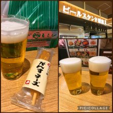 転地療養その16 ◉左:一度つぎ 右:二度つぎビール 何だか両手が塞がる感じな安芸国広島駅 昨日行ったたい焼き屋さんのお店の女性が是非行って欲しいと言ってたビールスタンド 近くのお店の何か買ってきてビールはここでというスタイルみたいだ カウンターの前にいた女性はセミナー受講で広島へ来て帰りしなに鶏串とビールでやってた 僕らはさっき買った「がんすチーズ」でやった ビールの後ろに見えるのは新幹線で食べるむすびむさしのお弁当