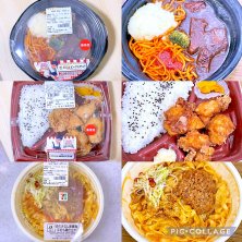 セブンで購入した弁当類。会社での昼食用に、3種類の弁当をコラージュにて纏めました。 中身は、 ・上段→香ばし麺の四川風麻婆豆腐焼そば。 ・中段→Suage監修 チキンと野菜のスープカレー赤米入り。 ・下段→帯広の名店ぶたはげ監修 ピリ辛炭火焼機豚丼。 です。
