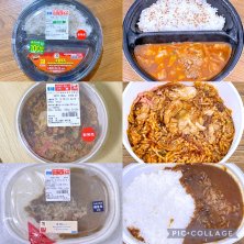 セブンで購入した弁当類。会社での昼食用に、3種類の弁当をコラージュにて纏めた。 中身は、 ・上段→水煮牛肉 牛肉の四川風唐辛子煮込み。 ・中段→甘辛ソースで炒めた豚そばめし。 ・下段→牛カレー。 セブンの弁当は全体的に美味い。牛カレーの米は令和3年度の備蓄米を使用しているそう。