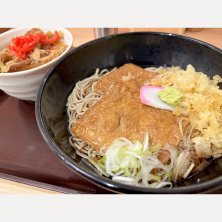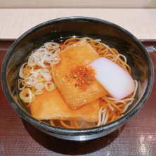 東京都大田区 羽田空港国内線第2旅客ターミナルの地下にある立ち喰い蕎麦の店、立喰そば酒処 つきじ亭のきつねそば。 油揚げ、ナルトとネギが載った蕎麦です。 羽田空港での朝の勤務前に立ち寄って食べました。立ち喰いの店ではありますが、店の奥に椅子席もあります。