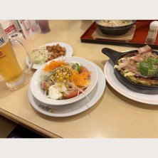 本日のセット サラダ、軟骨唐揚げ、お好み焼き にビール