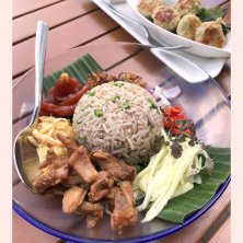1/6 ランチ。タイ料理。カオクルックカピなど カオ=ごはん クルック=混ぜる カピ=エビ調味 12月にバンコクで初めて知ったタイ料理、シンガポール🇸🇬でも食べられるんだ〜と注文してみました。チャーハンと共に沢山具材が乗ってて、お好みで混ぜまぜして頂きます。見た目も華やかだし、もちろん美味しい!ただ…ボリュームが少なくてびっくり。😇 奥はクラブケーキ。こちらも美味しい♪