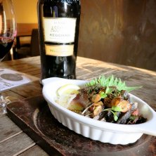 隠れスパにて、イタリアの赤の泡物と、カツオの塩たたき。このワイン美味しい。